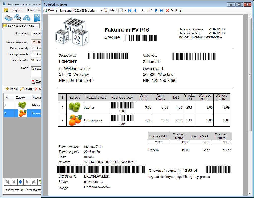 Ponadto automatycznie wygeneruje korektę WZ, aby stan magazynu był zgodny. Program do fv LoMag automatyczne pobiera obowiązujące dane kontrahenta z Głównego Urzędu Statystycznego na podstawie NIP, umożliwia zdefiniowanie własnych pól opisujących klientów, towary i faktury VAT. Program posiada wizualny edytor szablonów do projektowania wszystkich rodzajów dokumentów w wybranym języku, tworzący faktury z LOGO, zdjęciami i kodami kreskowymi, dający możliwość importu danych z Excela i plików tekstowych. Pełna integracja ze wszystkimi modułami LoMag pozwala na monitorowanie relacji między dokumentami, a także konfigurowanie raportów według własnych wymogów i eksport danych z tabel do Excela. Ten program do pisania faktura jest nie do przecenienia z uwagi na znaczną ilość zalet. Prócz tych opisanych wyżej należą do nich: możliwość importu istniejących danych (towary, stany, kontrahenci, ..) z plików XLS, XLSX, TXT, CSV oraz konfigurowalne wydruki etykiet z kodami kreskowymi dla towarów: EAN, CODE 128, QR Code. Niezwykle istotna w związku z obsługą programu jest jego intuicyjność w tworzeniu indywidualnych wydruków dla wszelkich dokumentów oraz możliwość wykorzystania danych zapisanych w pamięci komputera. LoMag obsługuje także format PDF, automatycznie przesyła dokumenty na skrzynkę email klienta, a także daje możliwość kontrolowania płatności na podstawie dokumentacji kasowej. Program pozwala na skonfigurowanie alarmów dla wybranych danych, jak również na dostosowanie wyglądu raportów i innych dokumentów do własnych potrzeb. Oprogramowanie LoMag daje użytkownikowi nieograniczone możliwości, co usatysfakcjonuje najbardziej wymagających klientów. Sprawi, że firma będzie wydajna i umożliwia zarządzanie dokumentacją za pomocą komórki. Opłaca się w niego zainwestować i wyprzedzić konkurencję.